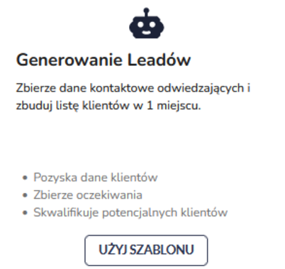 Z listy chatbotów wybieramy Generowanie Leadów i klikamy na Użyj szablonu.