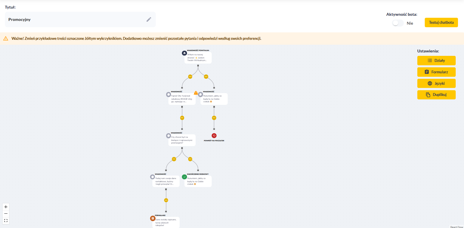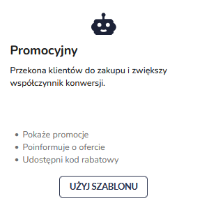 Z listy chatbotów wybieramy Promocyjny i klikamy na Użyj szablonu.