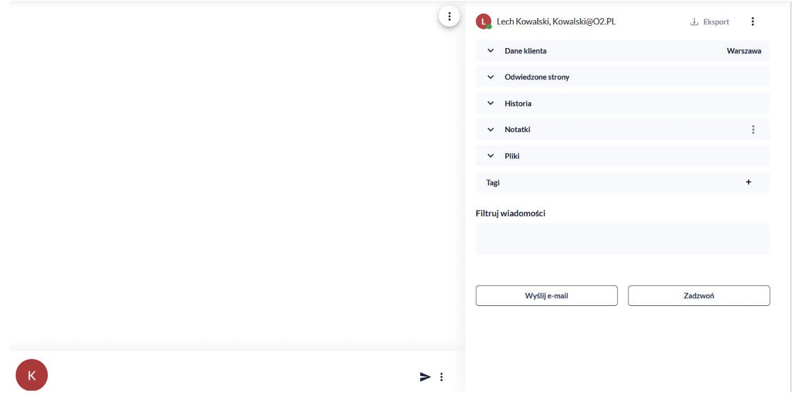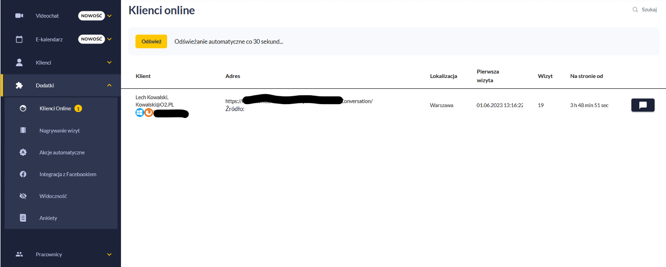 Klikając na dymek czatu po prawej stronie jesteśmy w stanie napisać do klienta: